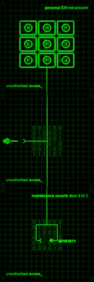 В терминале можно увидеть график матрицы вместе с сообщением "персональный IDN не предъявлен". Исходя из этого, предполагается, что эта комната управляет системой персональных IDN. Терминал также вмещает управление дверью в Область 8.