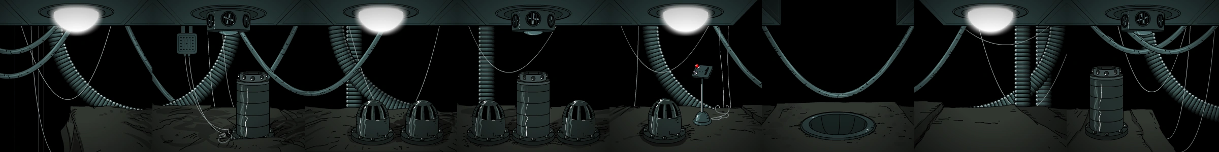 | Lobby - Cliffs - Tunnels - Chronon - Defense system entrance - Defense system corridors - Mainframe |