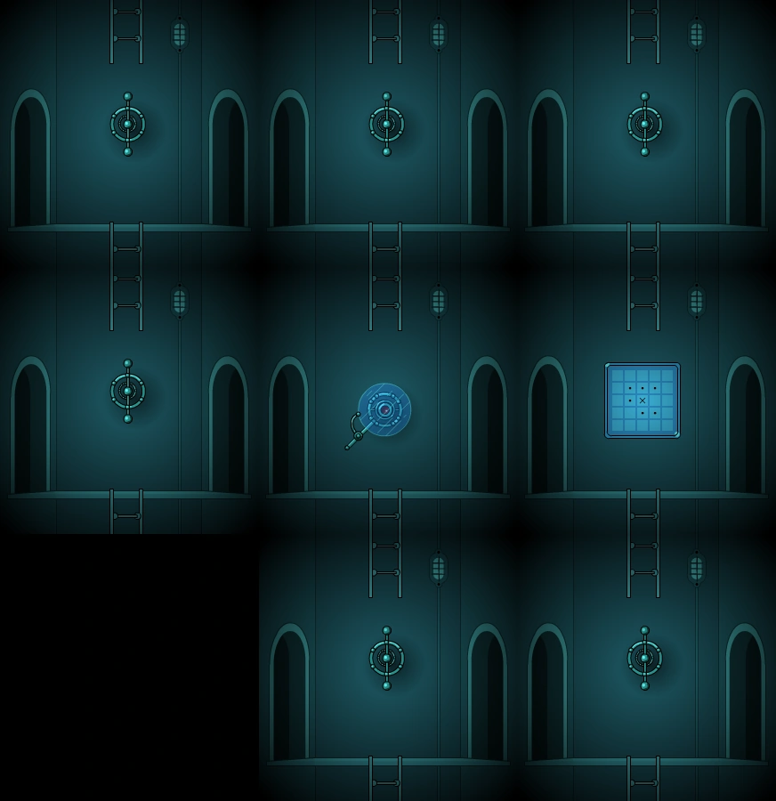 There are teal-colored levers in six of the adjoining rooms, and a map of their locations in room (0,1). All of the levers can be turned to open the passage-machine.