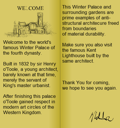 The Winter Palace was built during the Fourth Dynasty by a young architect, Sir Henry o'Toole, who later gained fame for this stunt. The structure is described in the pamphlet as a prime example of an anti-structural building. This feat was made possible more than anything by the fact that the Winter Palace and South Garden turned into parts of The Core.